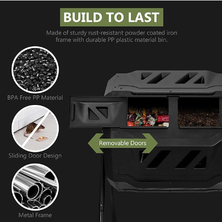 『Build to Last』Made of sturdy rust-resistant powder coated iron frame with durable BPA free plastic material bin, offers you a stable base and shatter-resistant compost bin which can last for years.